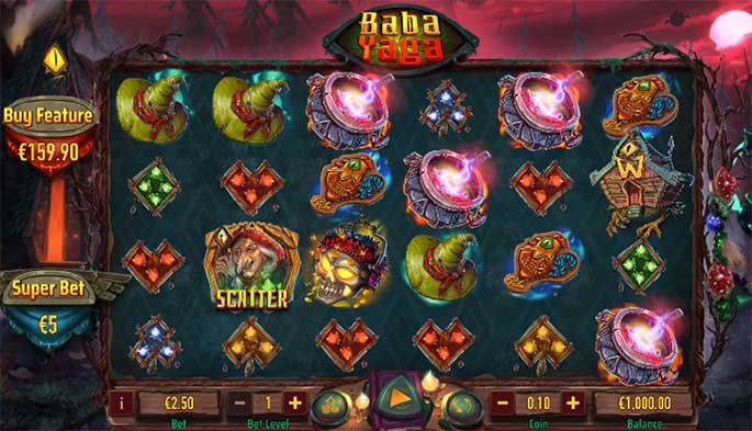 Baba Yaga là một video slot 6×4 với 25 đường thanh toán cố định, mang người chơi vào khung cảnh rừng sâu u ám, nồi thuốc sôi sùng sục và các biểu tượng lẩn khuất phép thuật.