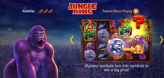 “Jungle King” là phiên bản slot được lấy cảm hứng từ thiên nhiên hoang dã. Khi tham gia, người chơi như đang đến cuộc phiêu lưu kỳ thú tại khu rừng nhiệt đới. Từng vòng quay là các loài vật hoang dã như sư tử, khỉ, voi,.. và có cả sự xuất hiện của cậu bé rừng xanh.